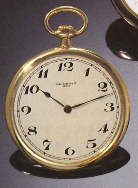 1992 - Antiquorum 17 octobre 1992 est 4-5000CHF, sold 5750CHF "Haas Neveux & Cie., Genève, No. 65158, case No. 50186, circa 1920. Elegant, extra flat, 18 ct. gold, keyless dress watch. C. Double body, very thin bassine pincée, polished, with knife edge. D. Mat silver, with Breguet numerals. Blued steel spade hands. M. 17-, rhodium plated, fausses côtes decoration, bearing the Geneva quality mark, 18 jewels, straight line lever escapement, cut bimetallic balance, blued steel flat balance spring. Signed on the dial and case. In very good condition. Diam. 45 mm. " |